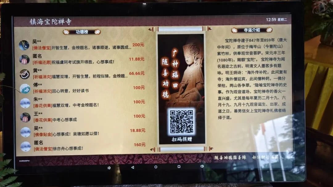 寶陀禪寺采用了智能功德箱,香客只要攜帶手機(jī),掃一掃就可完成禮敬三寶、添油祈愿等,與香客生活習(xí)慣更切合,同時(shí)解決了原有人工統(tǒng)計(jì)的繁瑣,增加場(chǎng)所規(guī)范性,方便寺廟管理。