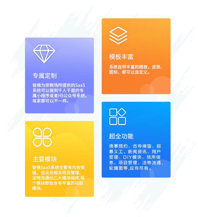智佛為宗教場所提供了兩款功能豐富的智慧宗教的SaaS系統(tǒng),由基于微信生態(tài)的小程序系統(tǒng)和基于微信公眾號平臺的H5公眾號系統(tǒng)構(gòu)成,內(nèi)含多套模板。